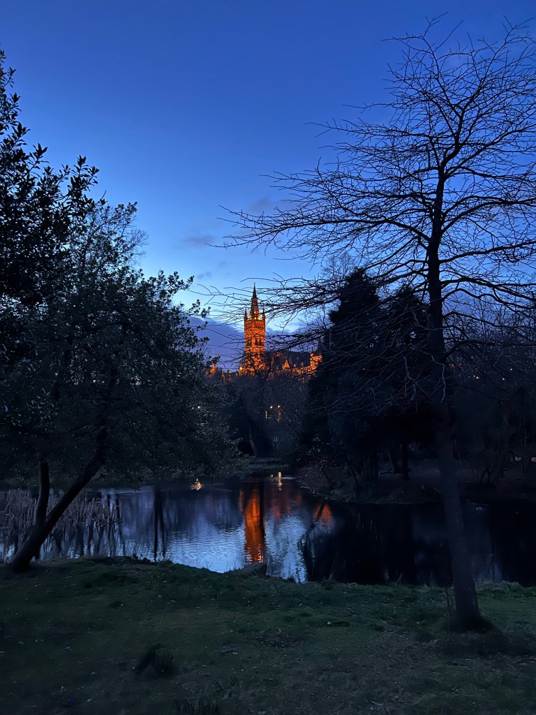 3/13 – Our travel day to Scotland started off a bit hectic. Though normally a quiet, Keflavik airport was teeming with people because Icelandair was having major technical difficulties with its ticketing service. Thankfully, though, they delayed the flights due to the issue and we were able to get on our flight in time! 🙂 When we arrived to Glagow it was around 4:30pm and we were ready to get settled in our Airbnb and find dinner. We went to a sushi restaurant called Hanami and enjoyed a whole bottle of ume (plum) wine! We explored Kelvingrove park at night and then headed back to our stay.