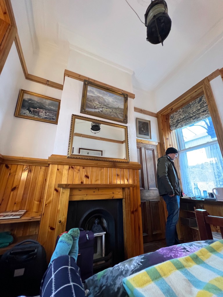 3/15 – The next day we packed up, sad to leave our beautiful Airbnb, and visited the Moroccan Coffeehouse. We only got a quick bite and drink here as they don’t serve food till 11am but it was still worth visiting. We also got sandwiches at Piece. Then, we picked up the car and drove to the University of Glasgow, explored the campus and nearby bookshops. Our drive up north took around two hours or so and we were greeted very kindly with tea, oat biscuits and cheese from our sweet host, Graham, at the Dalmally railway station. We felt revitalized from the snack so we walked to the Duncan Ben monument (around 1.5 miles) near our stay. A beautiful site at the end of the walk, totally worth it! 🙂 Later, we had a fabulous dinner at the Ben Cruachan Inn, just a little further north up the road.