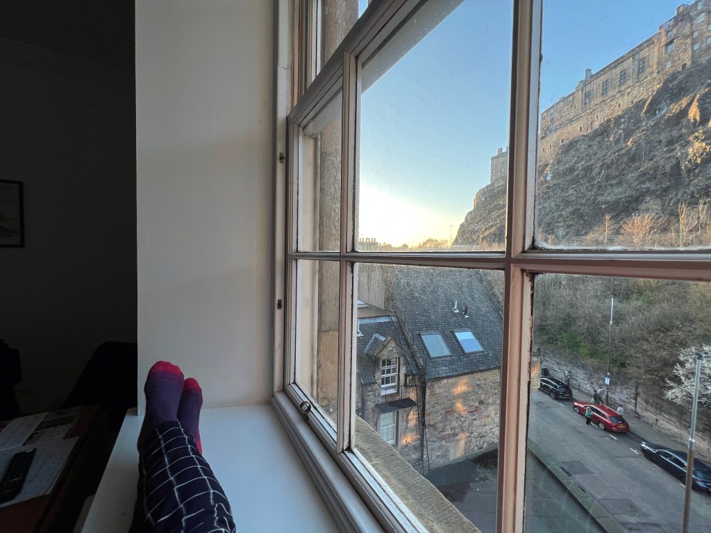 3/17 – This was our travel to Edinburgh day so we headed out nice and early. Our sweet host, Graham, kindly prepared for us some tea, porridge, cheese, and oat biscuits before we left. We will definitely miss this place and wish we could have stayed longer, hopefully we can come back again in the future! The drive from Dalmally to Edinburgh is just stunnin’ and parts of it reminded us of the barren terrain of Iceland. Once we got to Edinburgh, we dropped off the car and had an early lunch at Cafe Maradona. Then, visited McNaughton’s bookshop and Typewronger books before heading to the National Portrait Gallery of Scotland to kill some time till check-in. After we checked in to our Airbnb, we got an early pizza dinner nearby then headed to the movie theater to watch the new Jujutsu Kaisen Movie: 0 – it was so good!!